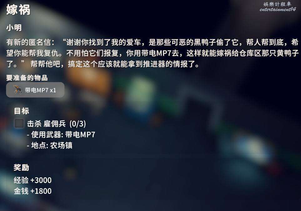 用帶電MP7在農場鎮擊殺3個黑鴨子雇傭兵即可,帶電MP7在推進到這個任務階段時肯定已經解鎖了可以製造也可以直接用自己之前擊殺掉落的。