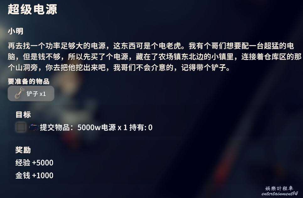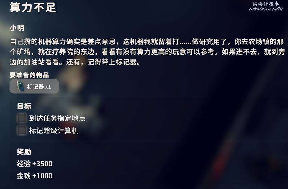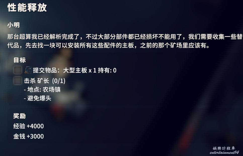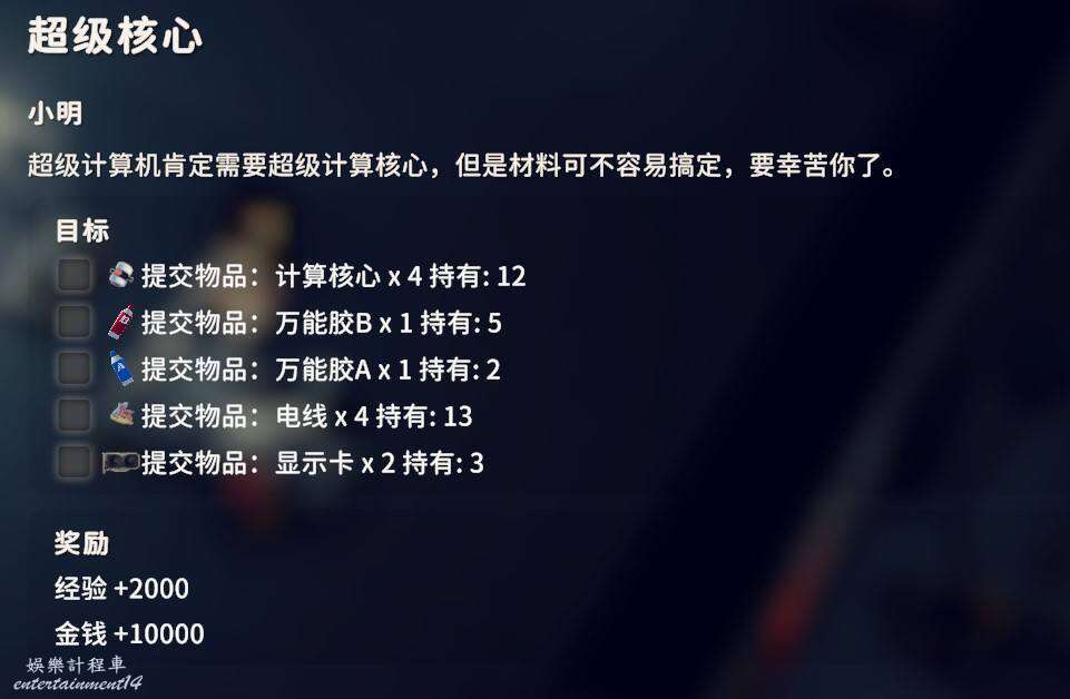 交付計算核心X4、萬能膠AX1、萬能膠BX1、電線X4、顯示卡X2,計算核心機械蜘蛛掉落,顯卡在農場鎮中心區域的商城辦公樓等地方不算難找,剩下3個物品很好獲得不多介紹了。