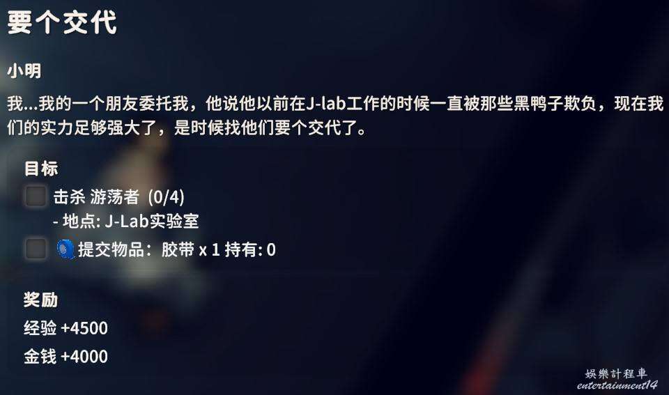 在J-Lab實驗室中擊殺4個遊蕩者,回來給小明交膠帶X1任務完成。