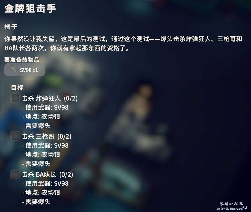 用SV98爆頭擊殺這三個BOSS各兩次,這三個BOSS全都是農場鎮的BOSS,三槍哥在伐木場附近,BA隊長在市政廳,炸彈狂人在雇傭兵營地旁邊的加油站。