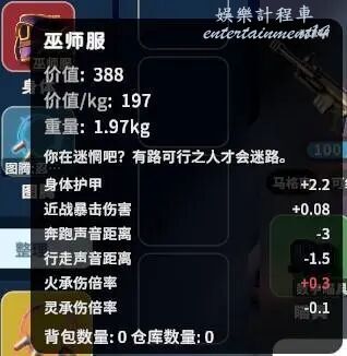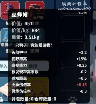 巫師套自帶降噪,以及非常重要的“被發現距離係數-0.2”,npc的視野距離是16m,-0.2就是乘以80%,可以將npc的視野距離削弱到12.8m,而螢幕上下的顯示範圍正好是13.5m。巫師套可以說解決了鴨科夫最大的痛點:螢幕上下視野太差,穿巫師套之後上下方向的敵人想要偷襲玩家會非常困難。