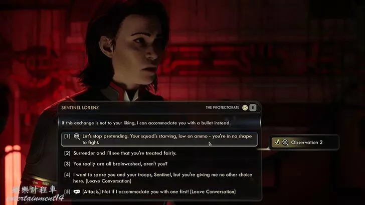 對話選擇:與哨兵洛倫茲交談時,你可以選擇外交手段或直接攻擊。