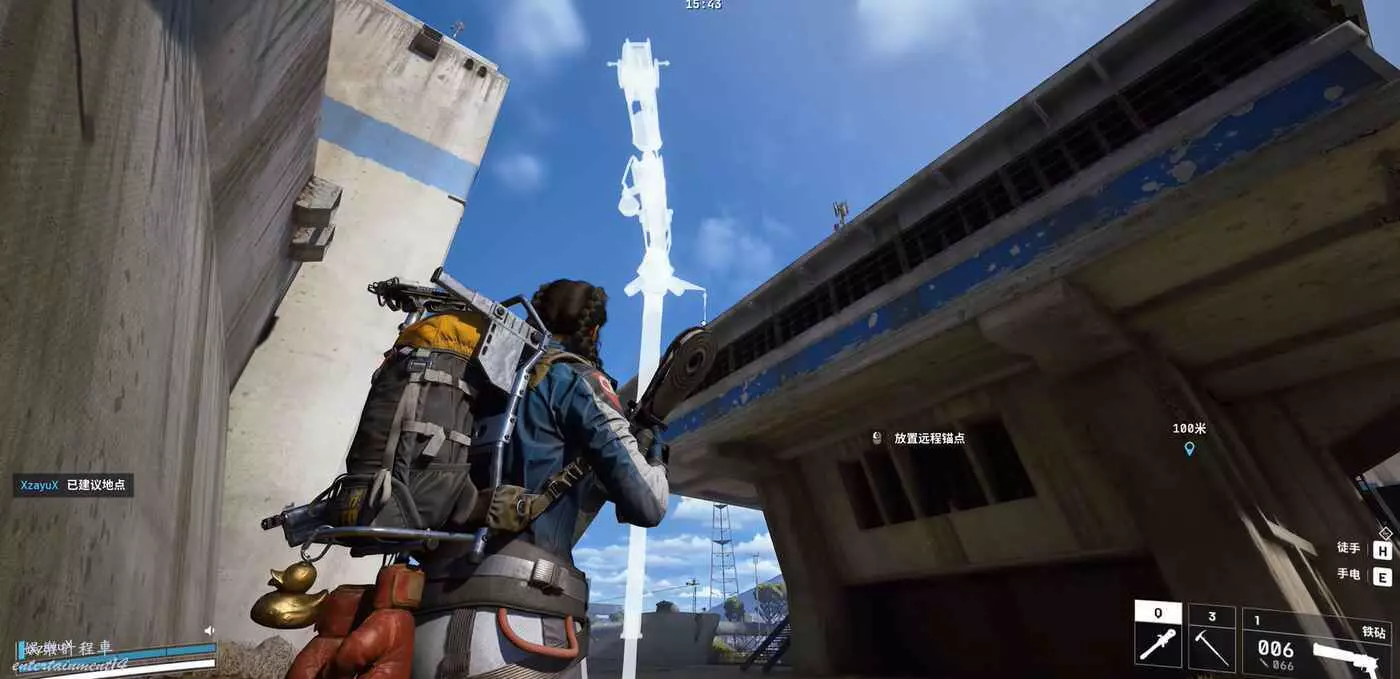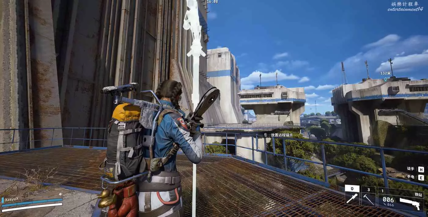 爽吃完這棟樓後,再回到一開始的塔樓頂端,對著南面另一座塔樓的部署一個滑索。滑過去前要注意周圍有沒有敵人和馬蜂。