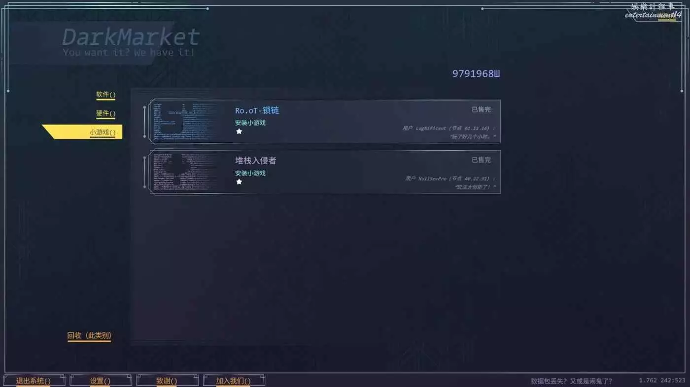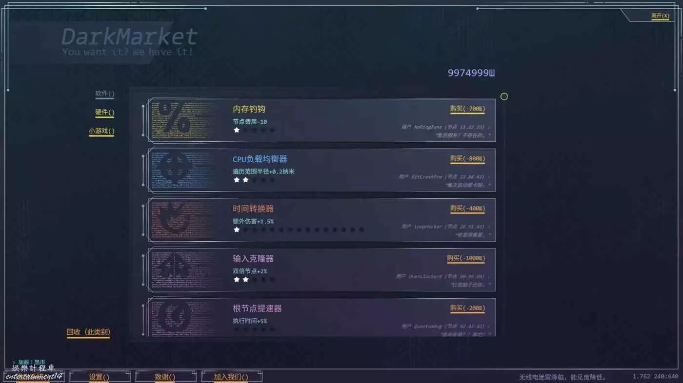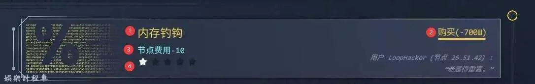 生存代碼 黑市說明 5 11 月 2025-11-05 廣告 作者:鐵板裡脊殲滅者 來源:遊民星空 黑市頁面中總共分為3個商品類別: 軟體 軟體介面主要用途是強化我們,方便挑戰更高的難度 黑市中的貨幣獲取主要依靠入侵時玩家們提取晶片資料獲得。 每個軟體的資訊如下: ①軟體名稱 ②購買價格 ③升級效果 ④當前等級 升級效果代表著本次購買帶來的效果不是整個軟體的升級效果。 硬體 可以強化敵人,挑戰更高難度時會用到,但是前期千萬不要點。 小遊戲 能夠購買兩個小遊戲遊玩,屬於額外小遊戲,前期別買。