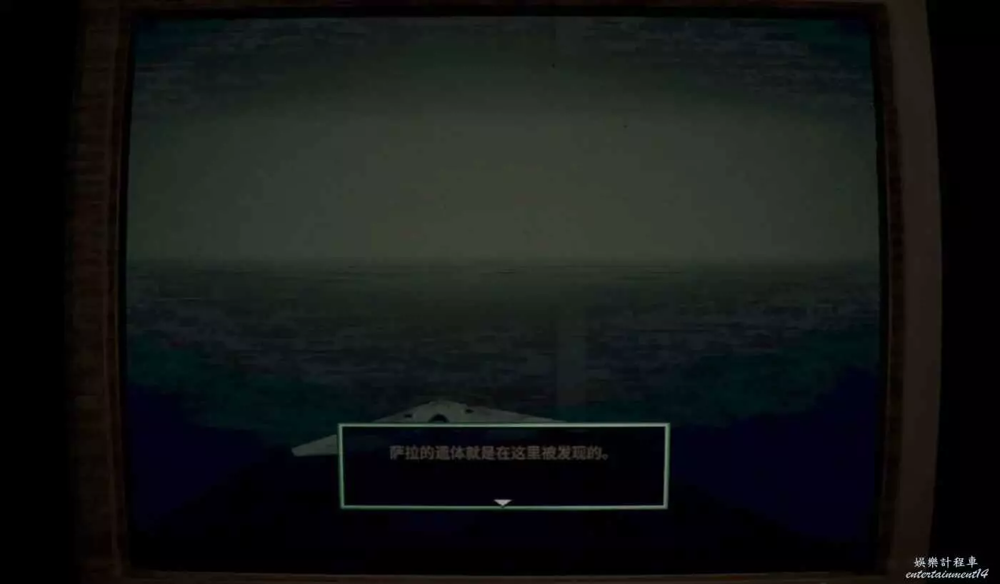 到了之後我們得知薩拉落水後遺體就是在這裡被發現的,此時我們要下水到湖底尋找妮娜(薩拉的狗)的遺體用來當做媒介,一定要潛到底才能找到,一共5個遺骨,注意不要在湖底瞎逛,水面霧很大,跑遠了可能會找不到船還迷失方向。