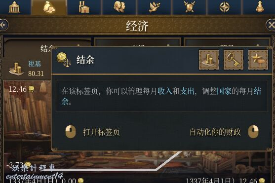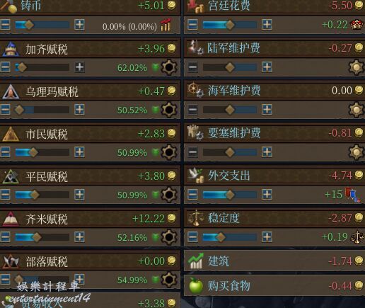 在結餘面板玩家可以操控各個階級的賦稅,鑄幣以及部分花費。