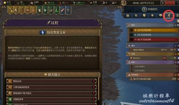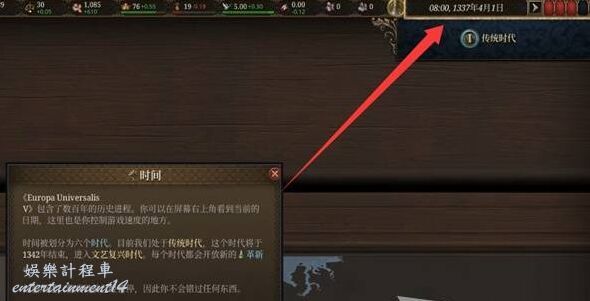 頂部功能條提供了各種概覽資訊:階層、金錢、穩定度、人口、正統性、威望、外交官、厭戰度、人力、水手等。
