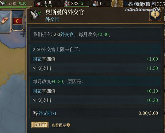 這邊提一嘴外交,外交的數值每一點代表一名外交官,例如,現在是5.00外交官,你就有五名外交官,當至少時有一名外交官你才能進行各種外交行為。