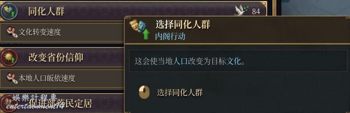 宗教和文化這兩個開局操作比較少,但一定要要專注於傳教和洗文化,因為這兩個一般是叛亂的主要原因,例如當我們打仗收割了一步法領土,我們先整合,然後就要關注地區的文化和宗教,歧視文化啊很容易造成衝突導致內亂,這時候就需要用內閣的牛馬們去洗地。