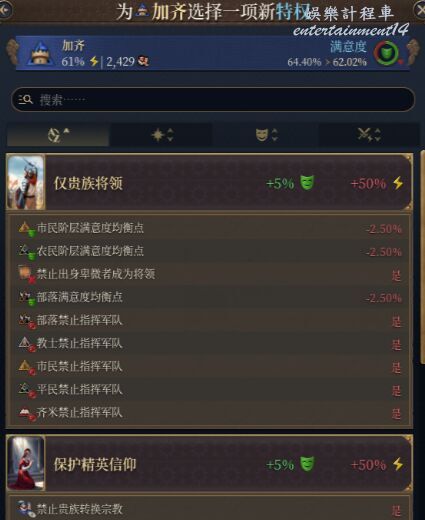 同時我們也可以為各個階級賦予權力來改變我們的價值觀,不過當你賦予權力後,這個階級的力量會增加,在議會的話語權更重,並且其他階級也會降低一定的好感度。