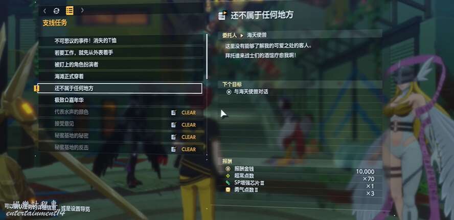 數碼寶貝物語 時空異客 還不屬於任何地方任務攻略 6 11 月 2025-11-06 廣告 來源:互聯網 “還不屬於任何地方”可在主線任務“冥界的王座”期間解鎖。 任務解鎖後,你將在數碼終端中收到海天使獸的訊息。 前往”戰士酒館”與海天使獸對話以開始任務。 之後前往深淵表層收集乾淨海水,從深淵海灘北側出口前往深淵表層。 收集地點就在東北方向前進幾步後掉頭,沿斜坡下行至箭頭標記處。 回到戰士酒館將乾淨海水交給海天使獸。 海天使獸離開後跟隨它前往中央城區南部。 再次跟隨海天使獸回到深淵,對話結束後任務也就完成了。