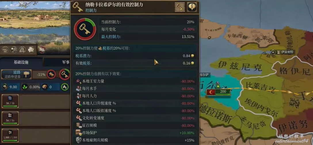 省份控制力受距離影響,前期三格外控制力即為負值,導致只能獲得基礎收益。