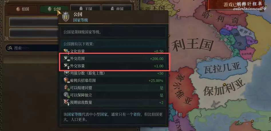 通過提升政體等級(公國→王國→帝國)增加容量,成為列強獲得額外外交容量(如第八列強+0.72)。