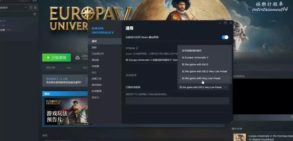 找到“啟動選項”欄目,選擇系統提供的“非常低質量”預設,使用此預設開始遊戲。