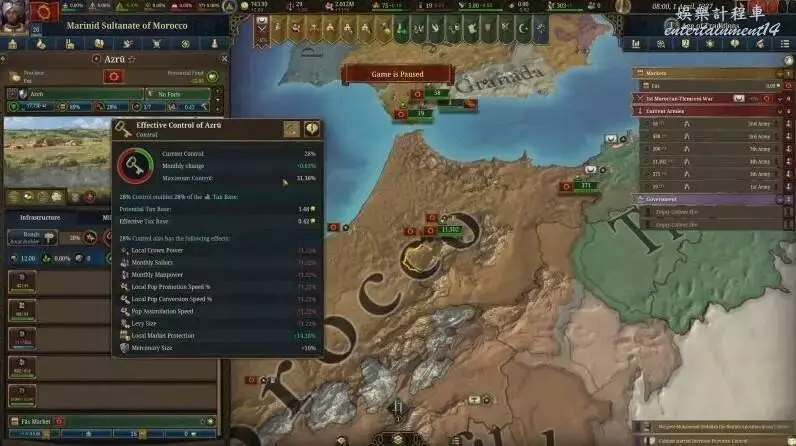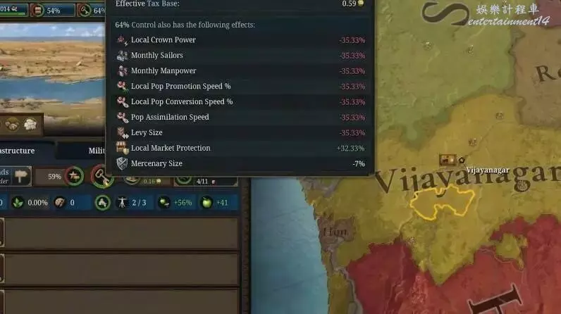 控制:這個百分比顯示你有多少權力。在100%的控制下,你得到100%的潛在稅收和人力。在50%的控制下,你實際上失去了那個地方一半的收入!你可以通過在一個省派駐一名內閣成員來暫時加強控制。