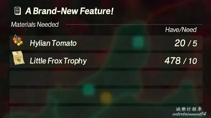 | 全新功能! | 材料感應器 | 在第2章完成”呼嘯風暴”後 | 獲得使用材料感應器的能力 | 海拉魯番茄 x5、小型西諾克斯戰利品 x10 |