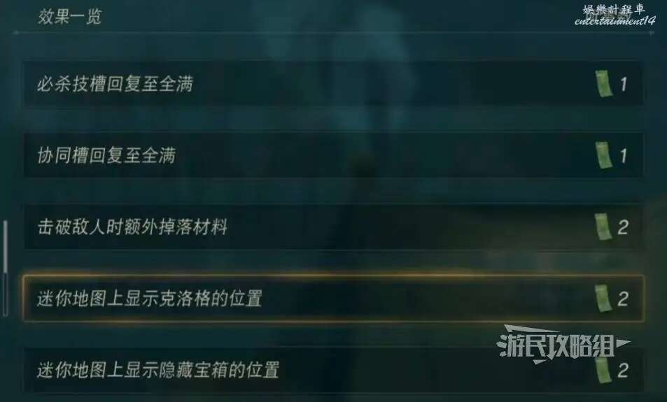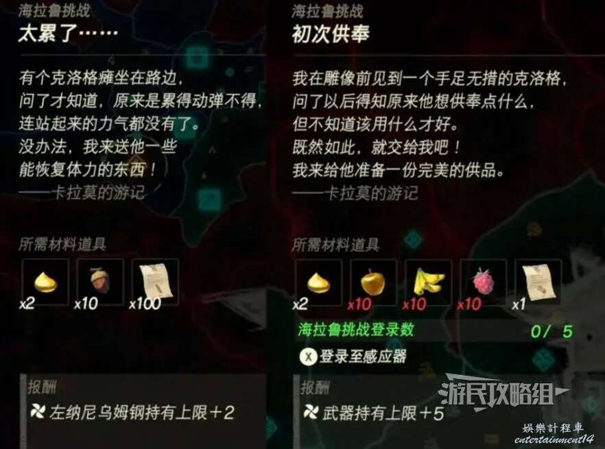 在露營時使用獎勵兌換券可以兌換在【迷你地圖上顯示克洛格的位置】;將主線推進至第四章後,也會解鎖相應海拉魯挑戰任務,完成後可【得知隱藏的克洛格數量】。