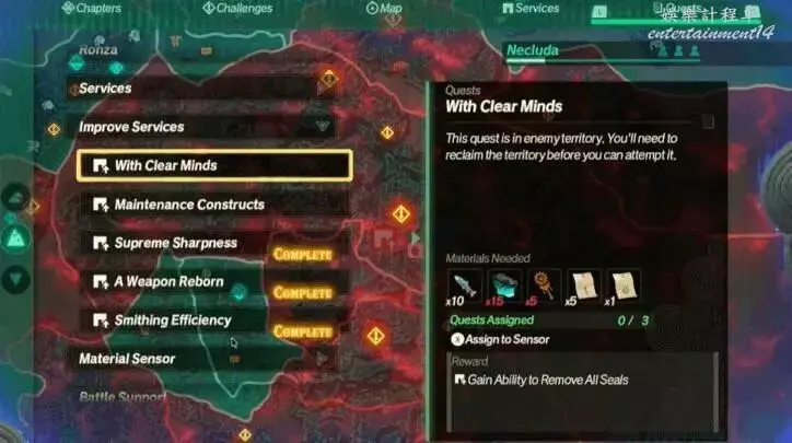 薩爾達無雙 封印戰記 武器封印去除方法 9 11 月 2025-11-09 廣告 來源:game8 1.首先完成頭腦清醒的任務 在開始移除武器封印之前,您需要先完成頭腦清醒任務以解鎖武器封印移除服務。 2.使用武器研究基地的拆除封印服務 完成後,您可以通過前往武器研究基地並前往移除封印服務來解除遊戲中所有武器的封印。 然後,您將被要求支付大量資源和盧比來移除封條。如果您想繼續,請滿足所要求的物品,然後您可以解除武器上的封印。