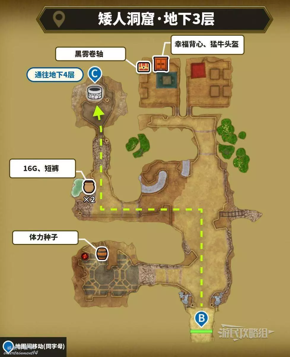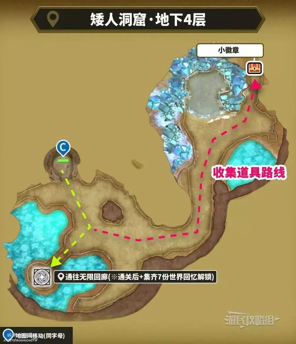 進入地下4層(也是矮人洞窟的最後一層),可以從東北邊的寶箱裡拿到【小徽章】。