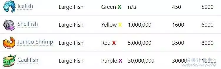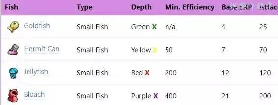 釣魚與其他的採集類Skill有所不同,釣魚的EFF不止影響獲得的數量,還影響釣魚的“深度”,不同的深度可以獲取不同的魚類。同時還有魚竿,魚餌,釣魚所在的釣魚區域會影響不同魚類的上鉤幾率。在三十級之前可以在W2左側的前兩張圖獲取到四種不同的“小魚”如下圖所示。