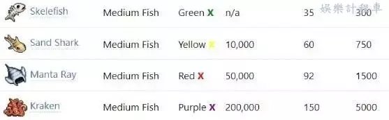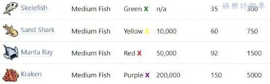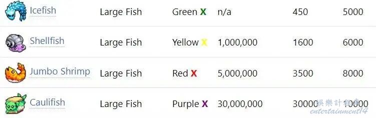當到達30級釣魚並解鎖第三個釣魚區域之後,會開放漂流瓶和海島玩法。並且在第三個區域釣魚會獲得四種不同的魚,如下圖所示。