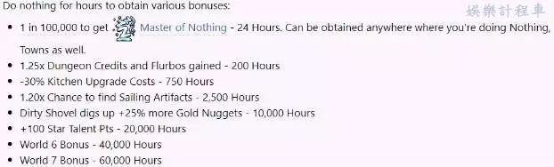 該島會記錄無任何事情的(Nothing)掛機時間,掛機到一定時長會給予獎勵。獎勵如下圖
