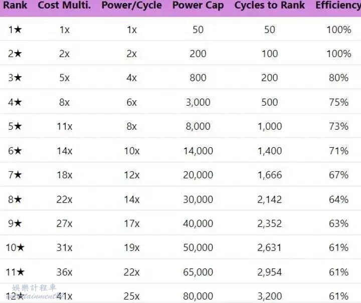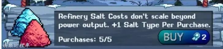 從第二個鹽開始,每購買一次該升級項,對應的鹽的消耗材料中,上一級鹽所需要的消耗量就會減少,會從上表內的CostMulti減少為Power/Cycle。以八級黃鹽為例子:未購買前需要22x的資源消耗,即需要44紅鹽,也就是紅鹽至少要升級到13級才能供應;但購買之後降低為14x,即需要28紅鹽,10級紅鹽即可供應。