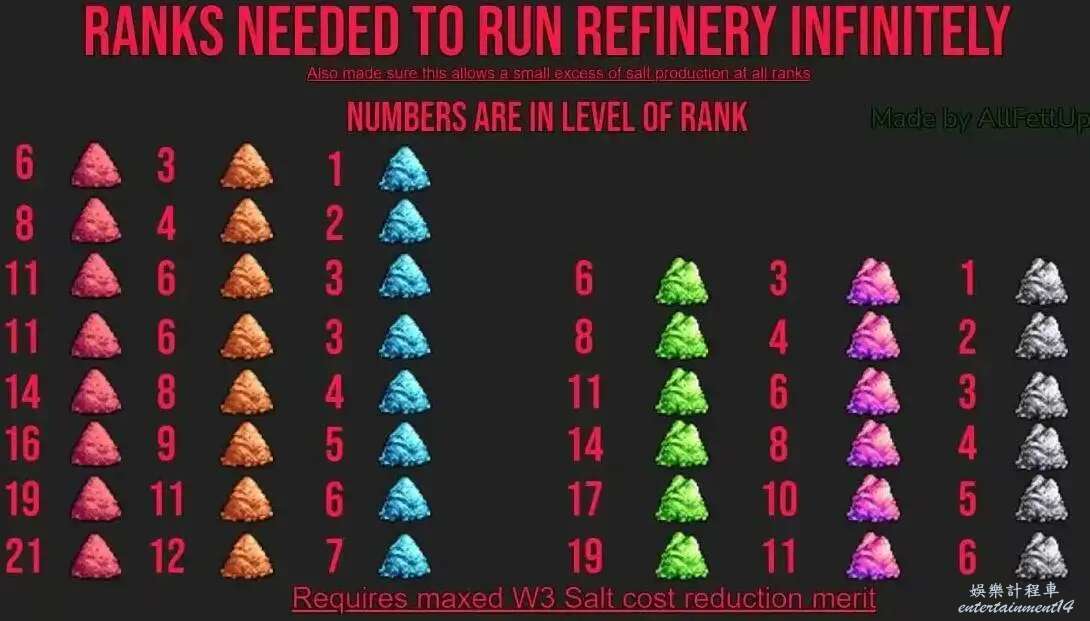 從第二個鹽開始,所需要的的消耗材料內就會出現上一級的鹽,每一級的產耗可以根據這張表內的 CostMulti進行查詢。