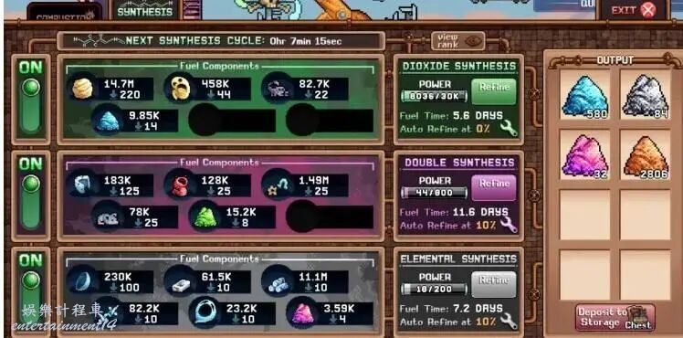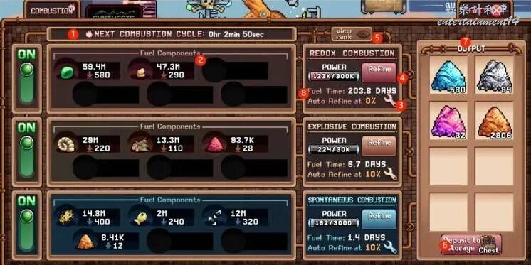 1.精煉爐每一定時間內完成一次迴圈,將2內的資源消耗,生成對應的鹽。這裡顯示的是當前迴圈還有多久結束。在沒有任何加成的情況下前三鹽(第一頁)的一輪迴圈時間為15分鐘,後三鹽(第二頁)的一輪迴圈時間為60分鐘。