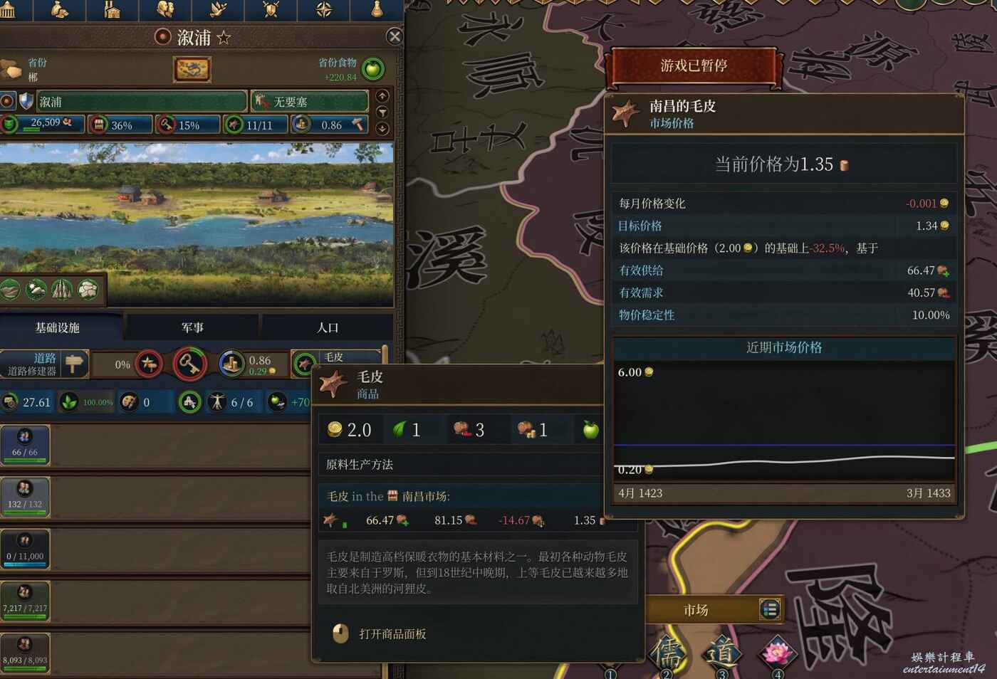 上邊兩張圖比較清楚了,漵浦的皮毛原產等級為11級,在僅有部落民幾乎不存在buff的情況下,實際產量為11.08,然後在南昌市場上,毛皮的價格為1.35,那麼漵浦的原產收入則為14.958