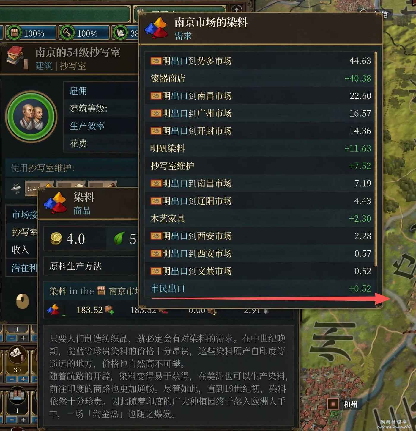 那麼,想要在火星人的壓力下搶回來利潤,只能生產效率了。上圖可以看出,雖然丹徒的市場接入度0.97影響了實際的建築產出(同比影響原料的投入量),但是在我28級建築帶來的21.6%規模效應(這裡倒確實是v3)和其它雜七雜八的加成下,我還是生產了比28個分散的紡織工行會更多的布匹。