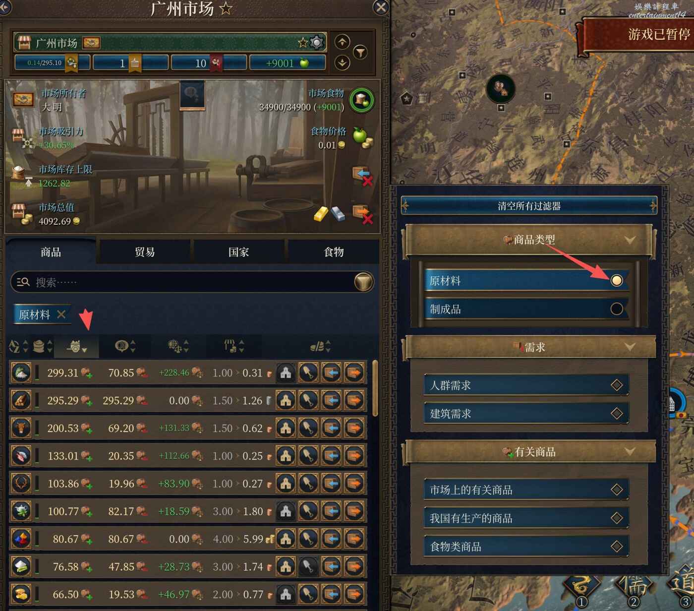 最直觀的辦法,是從城鎮介面點開其所屬的市場,然後在選擇按供給排序並點上原材料篩檢程式