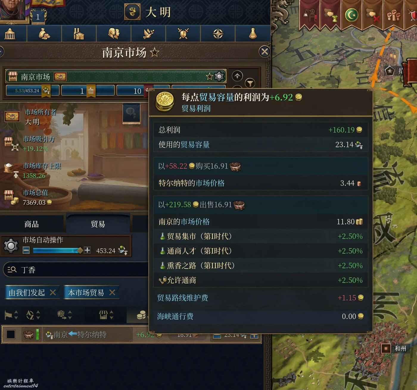 一共從香料群島進口了16.91的丁香,售價減去進價減去貿易維護費,最後算出來總利潤是160.19,非常可觀,然後乘以當下的王室力量37.44%,得出一個59.975的數值(四捨五入為59.99)。