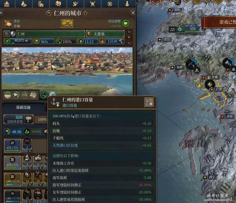 我們把滑鼠放在仁川的港口圖示上,可以看到整個港口的容量是100%。它由港口建築,和天然港口區位度兩部分組成。前者隨著科技的解鎖我們可以將各種建築挨個造上,後者則是遊戲開局就設定好的。