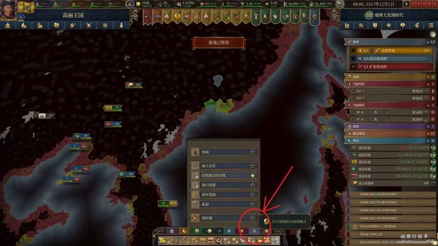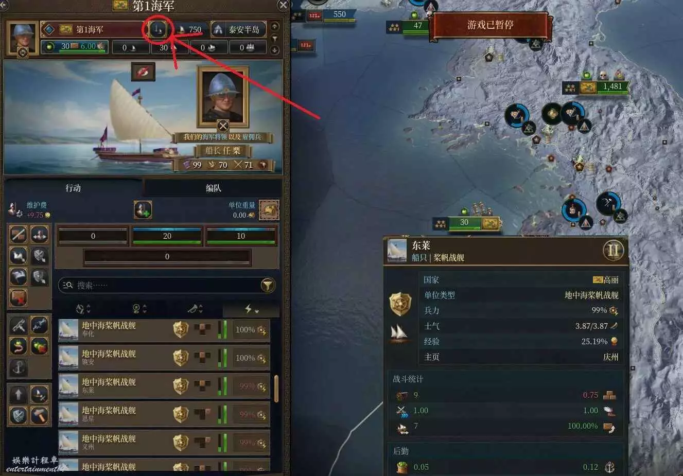 這裡我們調來一隻由30艘槳帆組成的艦隊,由於每一艘槳帆可以提供0.12的海上存在,在加上將領屬性和科技加成以後,這樣一隻艦隊一共可以為我提供3.6*(1+0.35+0.43)=6.4的海上存在。但實際上遊戲裡光把船開過來是沒用的,你需要點左上角紅圈標識的UI,選擇海上巡邏,並勾選你需要巡邏的海域