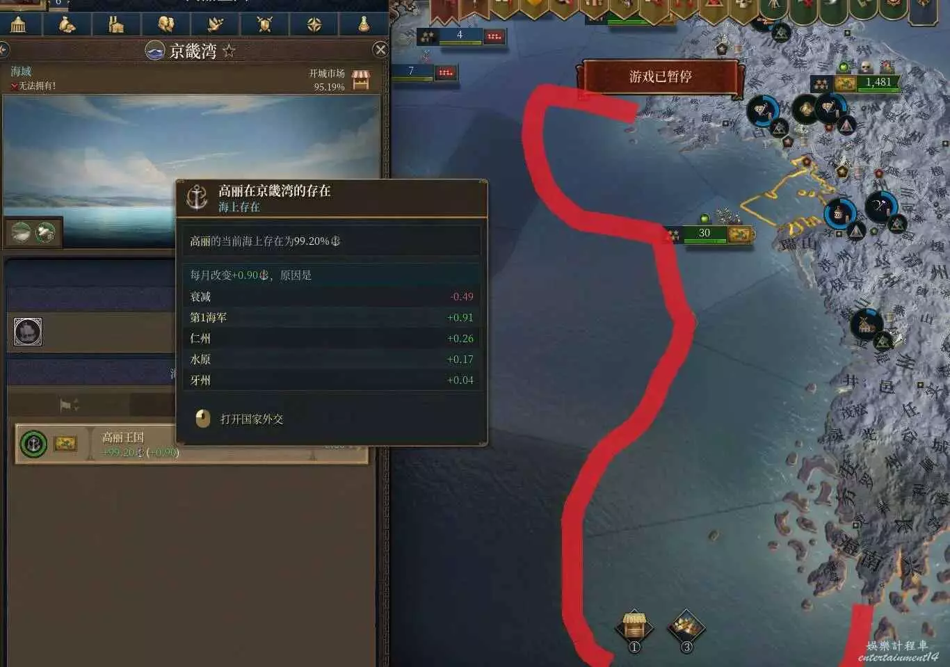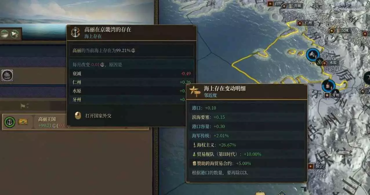 那麼海上存在又是什麼呢?這裡我們選中京畿灣,可以看到我們現在有99.66%的海上存在,並且每個月在衰減0.5%,由於這片海域對應著三個陸地省份,這些省份的港口容量以及一部分建築會提供基礎的海上存在,但很顯然光靠這些是不夠的,因此我們需要請出我們的海軍
