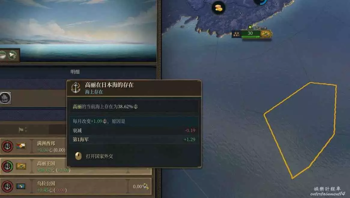 也就是說你無法同時降低這兩個值,即使你有100%的海上存在,也依然會吃到經由海洋的鄰近度損耗。但即使如此,一格5點的損耗也遠比陸地要低,並且海權主義和相關革新可以進一步減少這一數值,大概能到3左右,當然也可能能疊更低,只是我暫時還沒玩到。