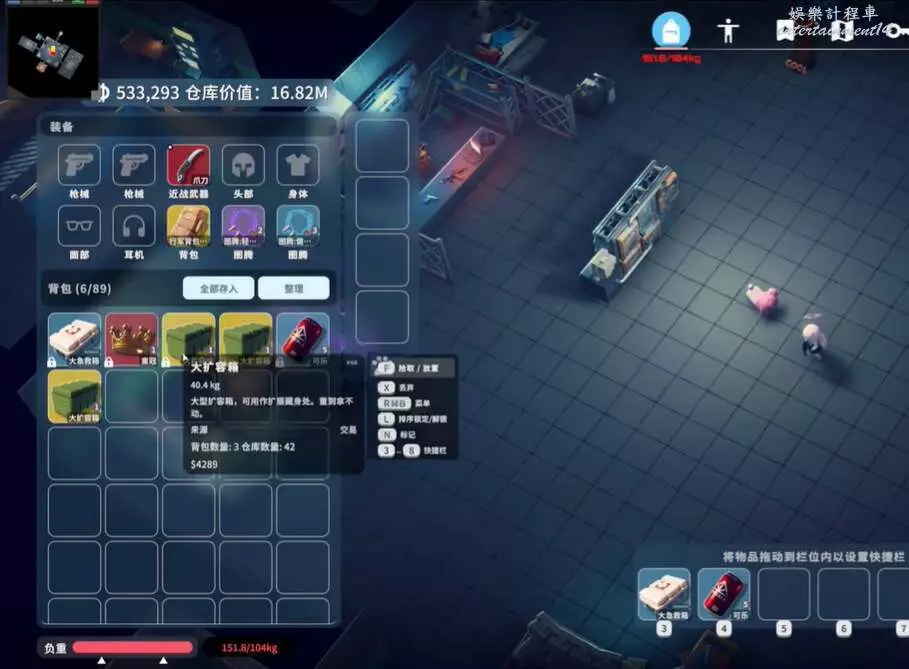 逃離鴨科夫 (Escape from Duckov) 狗狗背包基礎與擴容途徑 13 11 月 2025-11-13 廣告 來源:互聯網 狗狗背包是左上角那個單獨的格子。它的核心功能是提供一個不受負重影響且死亡時物品不會掉落的安全儲物格,非常適合存放任務關鍵道具或像大擴容箱這類沉重且重要的物品。 目前,讓狗狗能攜帶更多物品,主要有以下幾種思路: 途徑 核心方法 說明 科技樹升級 提交特殊道具點亮科技樹 可永久提升小鴨背包容量等基礎屬性。 任務與技能 完成“擴容口袋”任務 在技能增強器解鎖背包專家I技能。