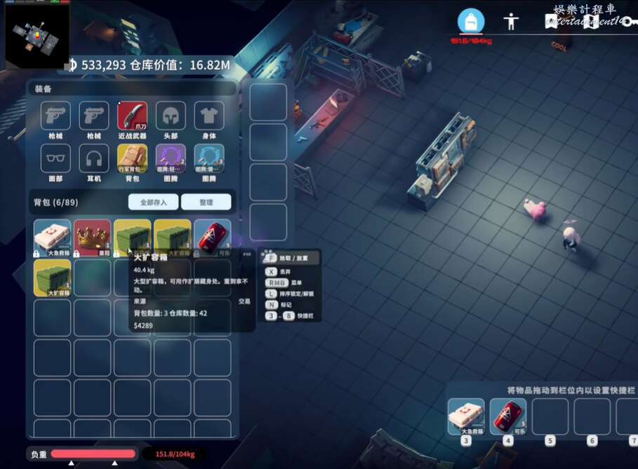 狗狗背包是左上角那個單獨的格子。它的核心功能是提供一個不受負重影響且死亡時物品不會掉落的安全儲物格,非常適合存放任務關鍵道具或像大擴容箱這類沉重且重要的物品。