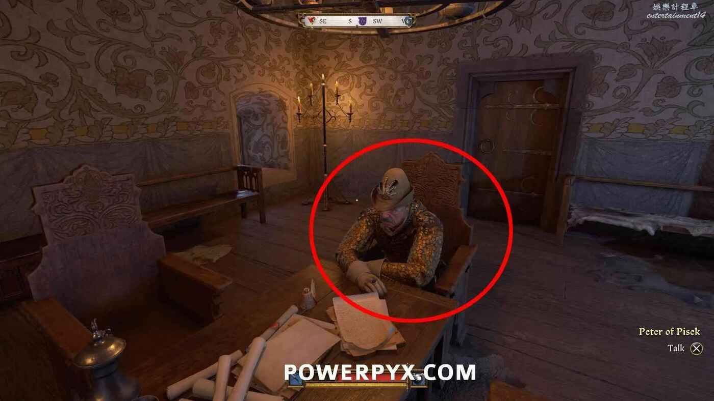如果已經通關了本體的主線劇情,依然可以在庫滕堡找到皮塞克的彼得,不過他也有可能往返於蘇赫多爾和庫滕堡之間的道路上,但位置始終會以紫色圖示標記出來。