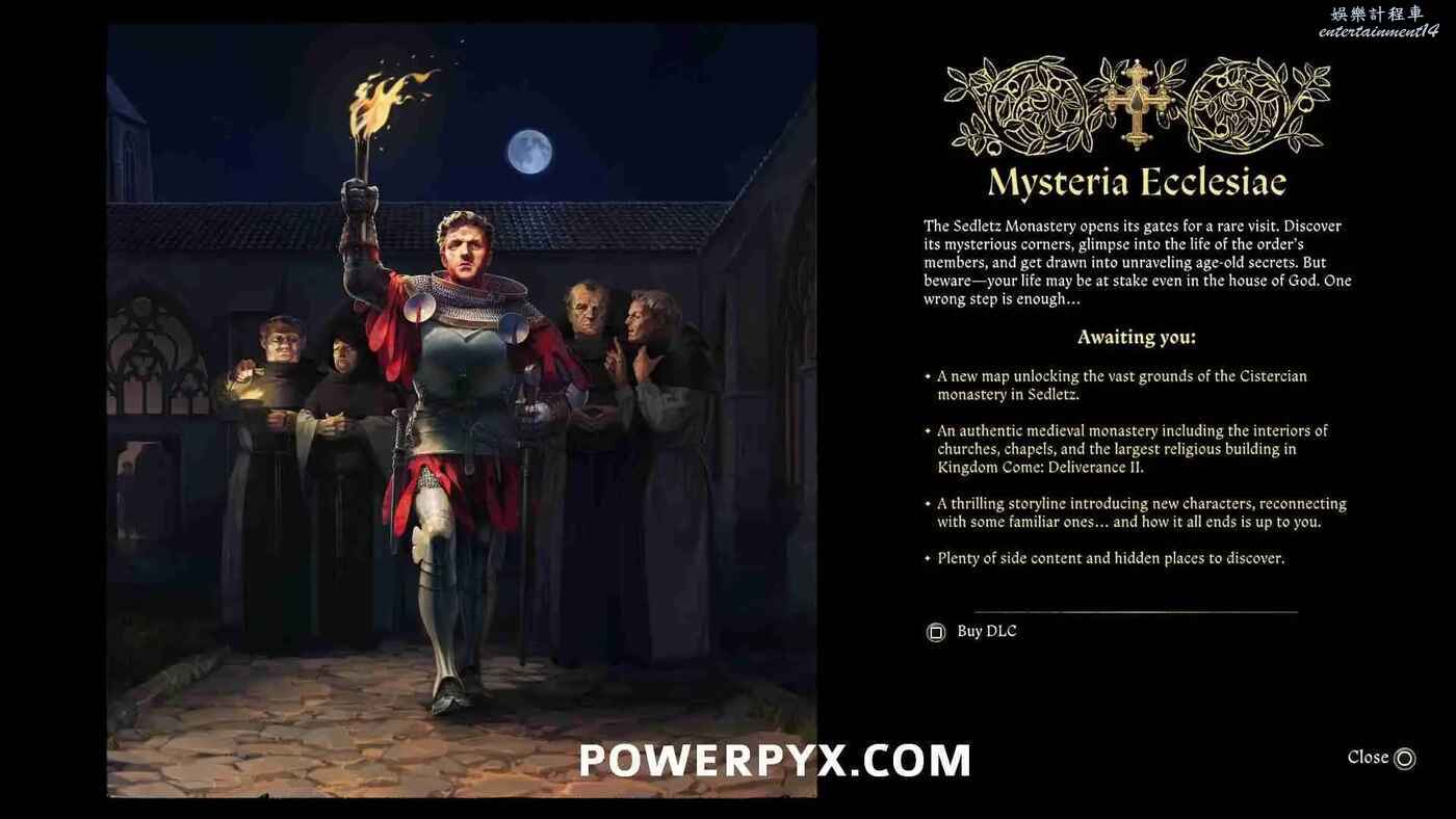 此DLC包含一張新地圖,解鎖了賽德萊茨修道院的廣闊場地;一個真實的中世紀修道院,包括教堂、小禮拜堂的內部,以及《天國拯救2》中最大的宗教建築;一條引人入勝的故事線,加入了新角色,並與一些熟悉的面孔重逢……以及雙結局。以及大量的支線內容和隱藏地點可供探索。