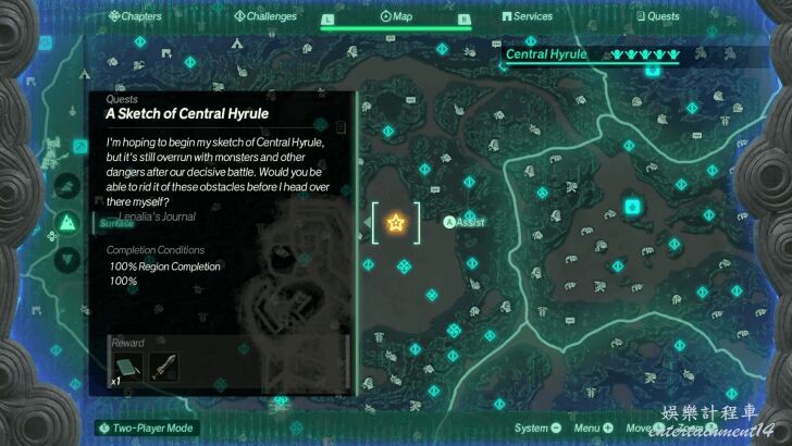 通過海拉魯地圖介面觀察各區域進度,藍綠色進度條直觀顯示完成比例。
