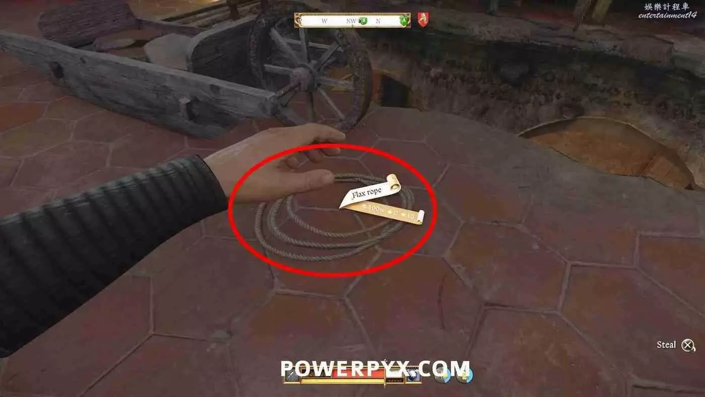 注意此處會有兩個工人在旁邊說話,扔石頭把他們引到比較遠的地方,然後快速拿走繩子即可。建議提前準備好存檔,如果被抓就讀檔重來。