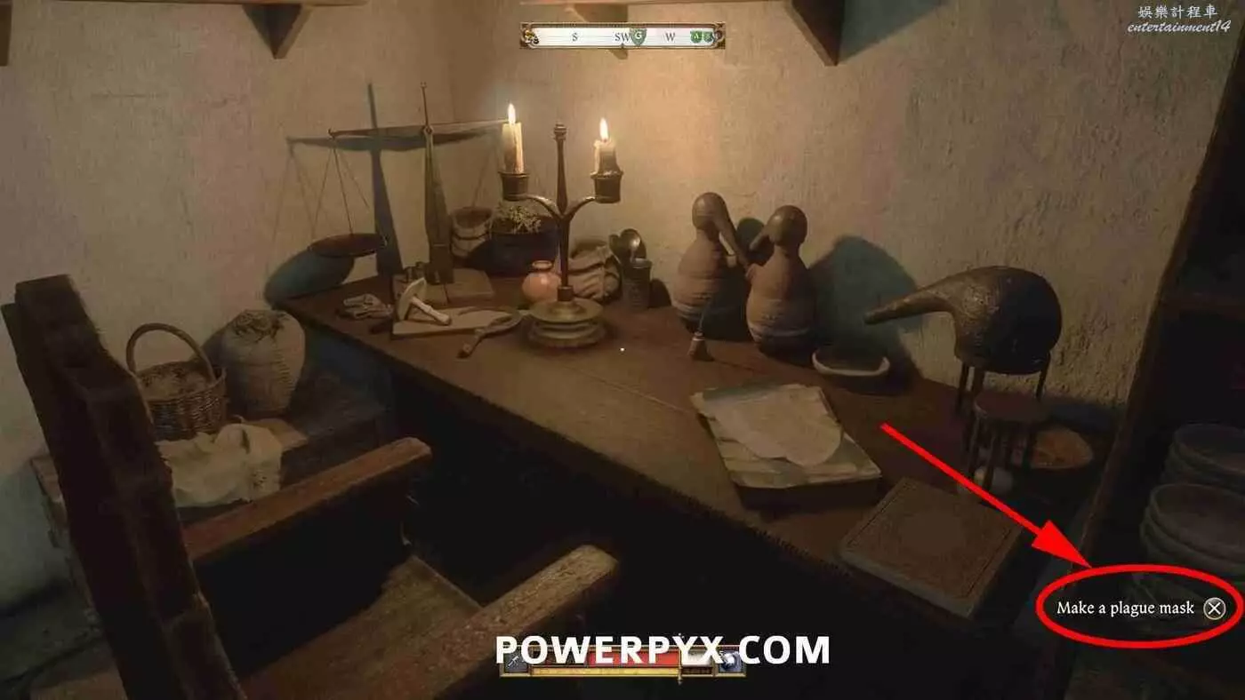 在煉金台所在房間右側有一張桌子,與桌子互動製作防疫面罩。如果已經集齊了所有材料,右下角會出現【製作防疫面罩】的提示。