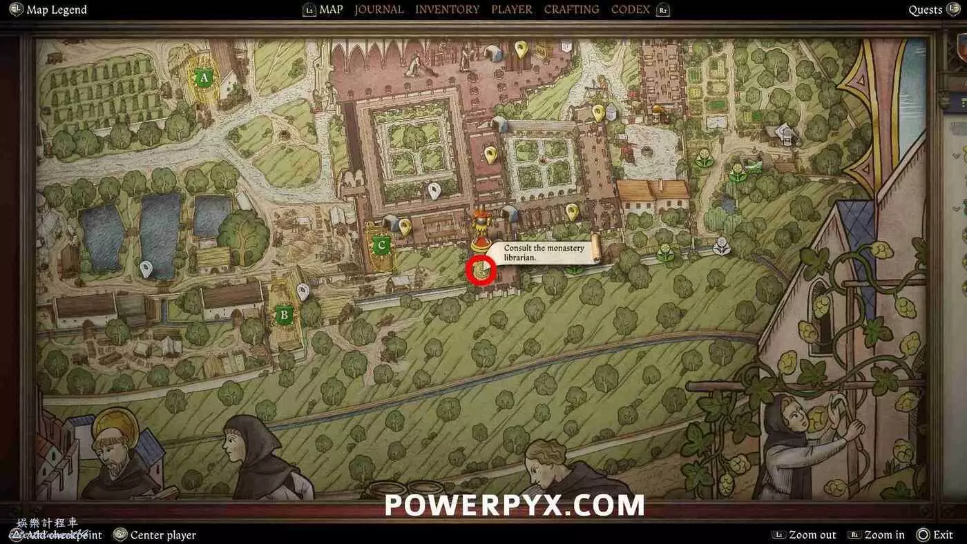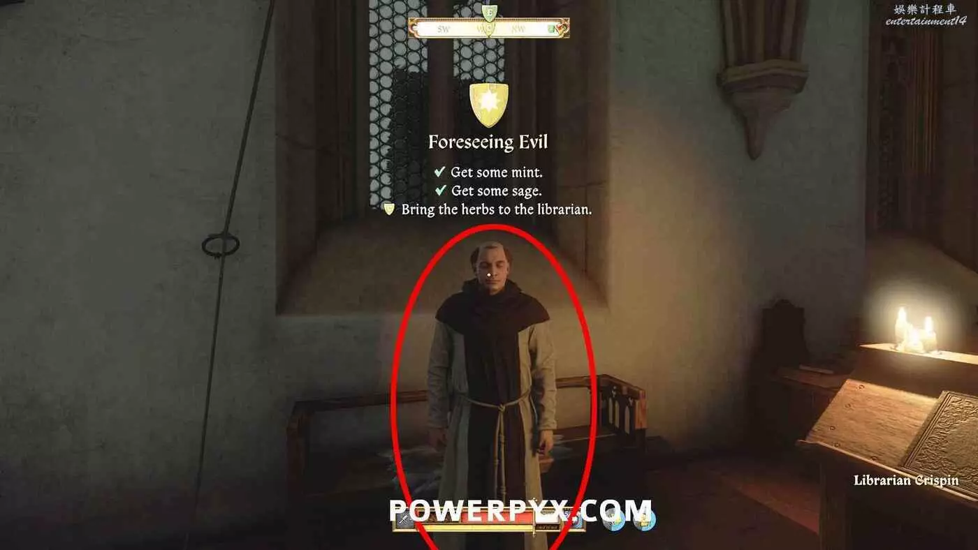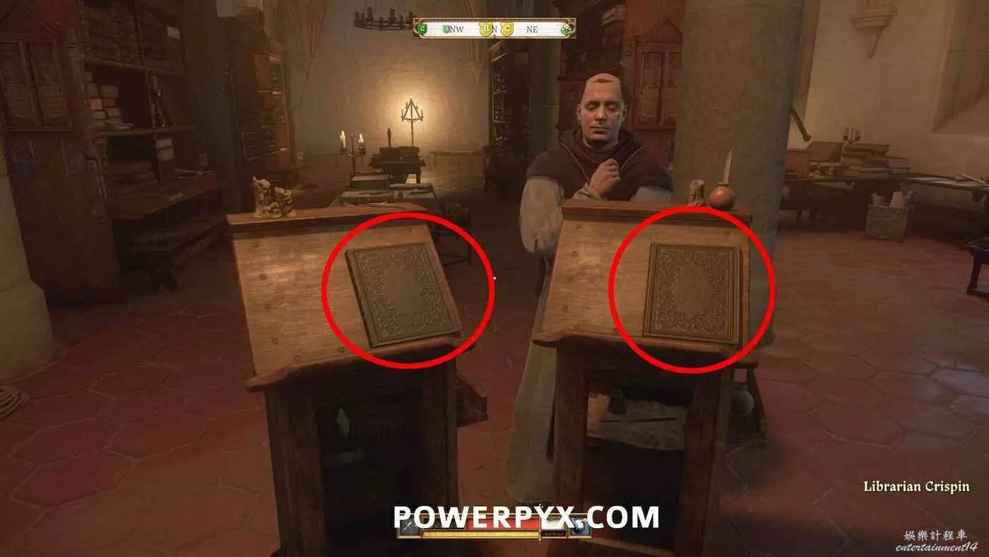 通過走廊上的門進入圖書館。與裡面的圖書館員克里斯平交談,位置會在地圖上標記顯示。
