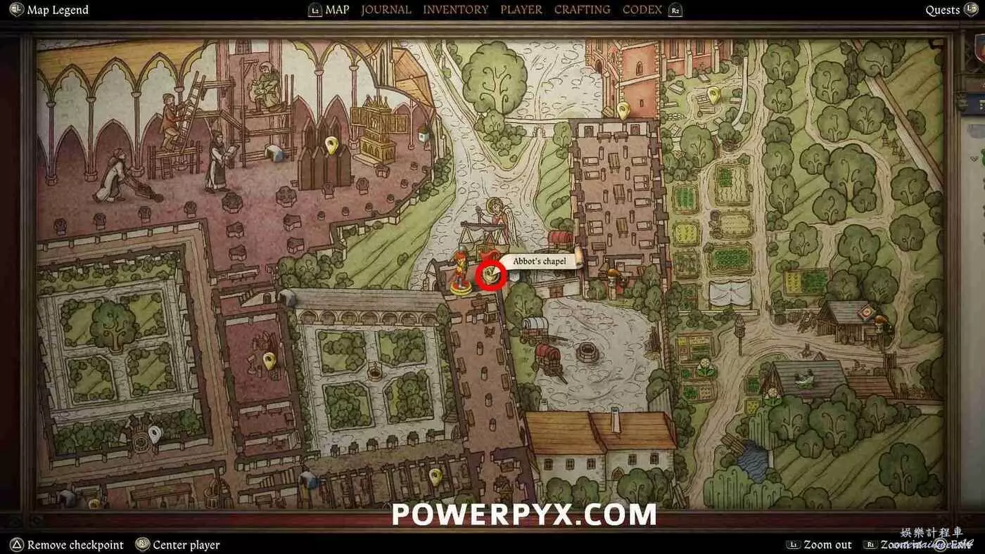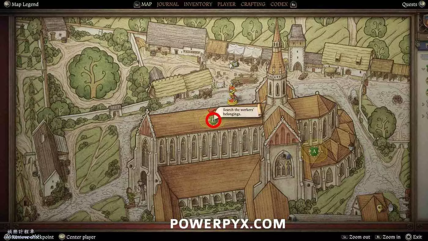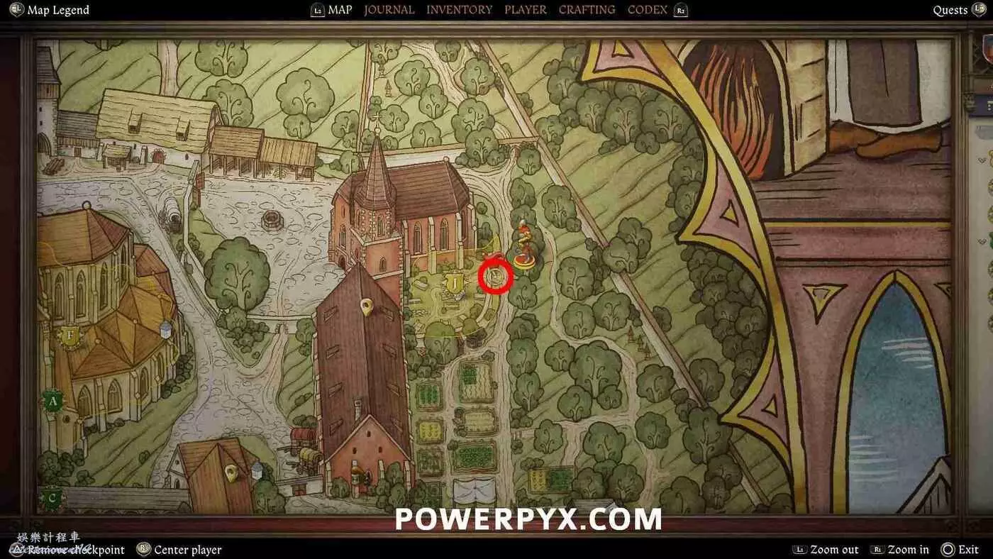 打開地圖並完全放大。在醫務室的正西方向可以看到【院長的小堂】,地圖上以一個手持天平的天使標記顯示,這裡就是目標位置。