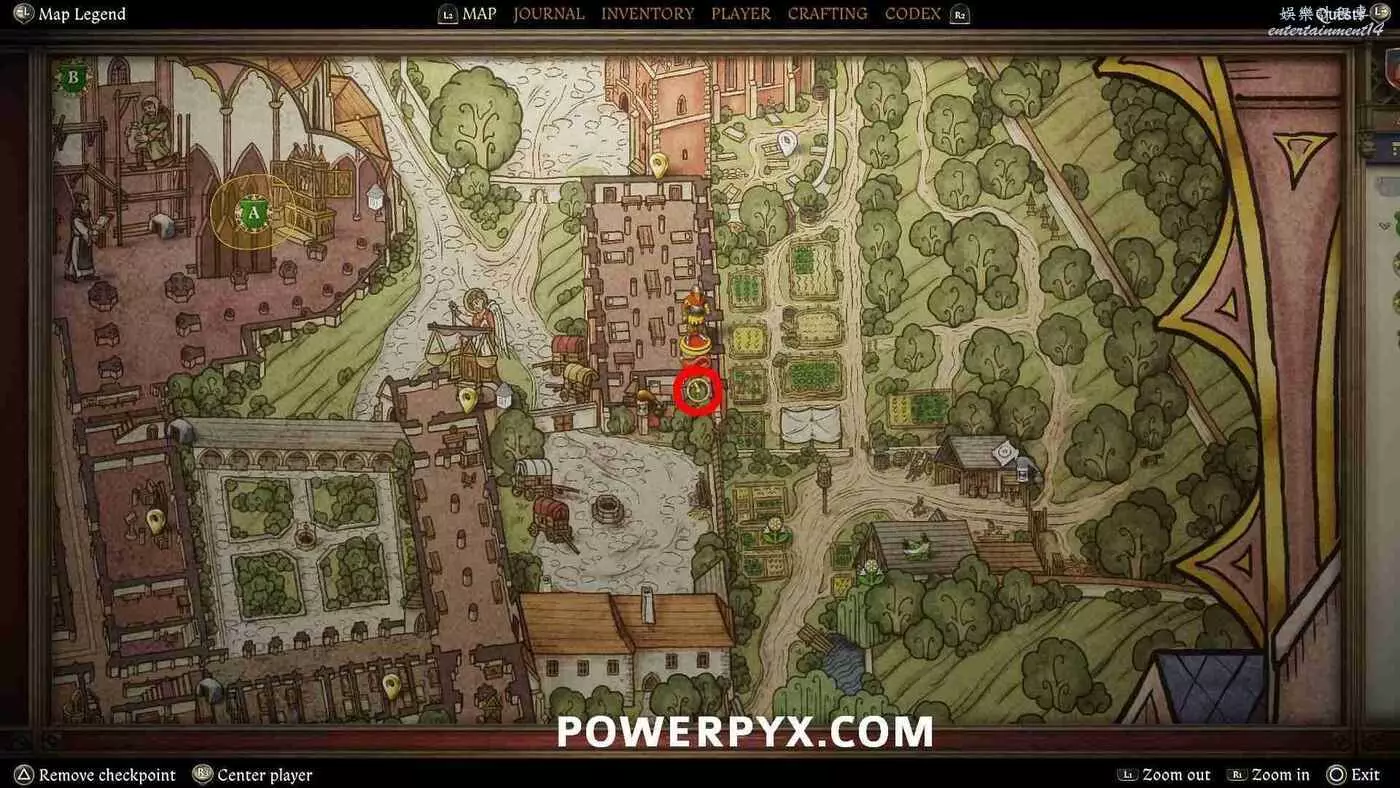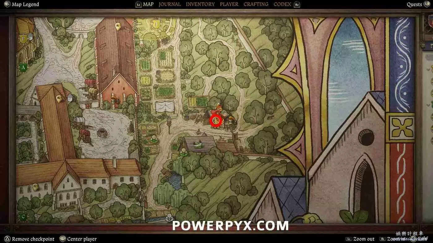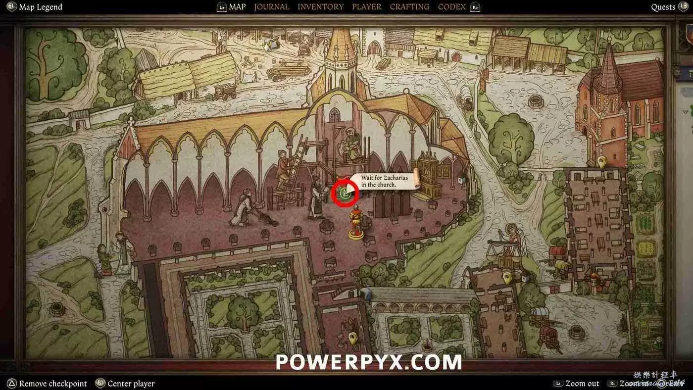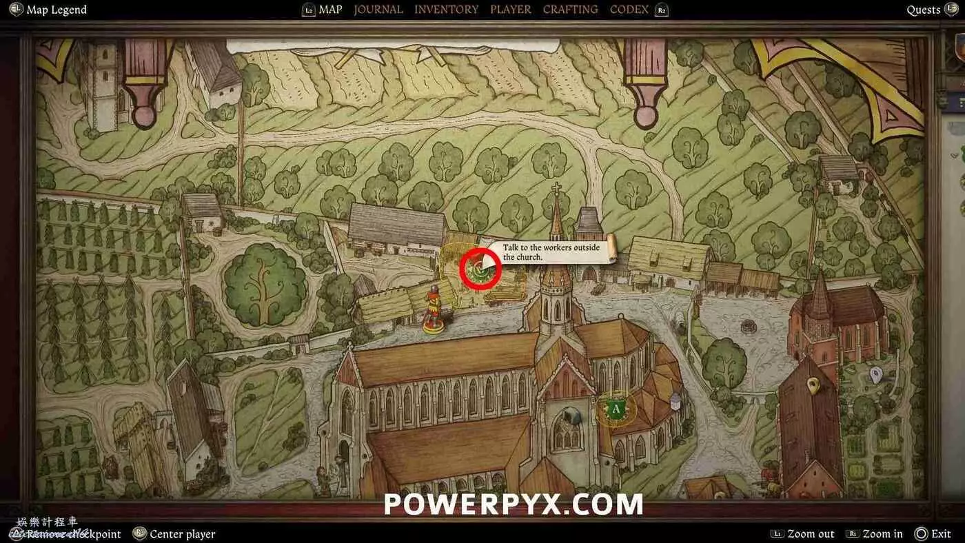 打開地圖並完全放大。在醫務室的正西方向可以看到【院長的小堂】,地圖上以一個手持天平的天使標記顯示,這裡就是目標位置。