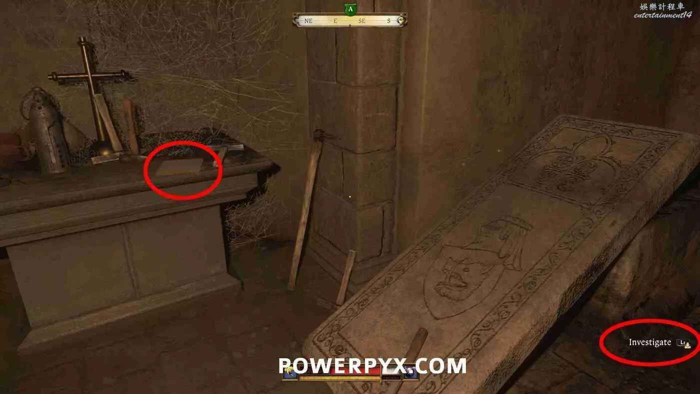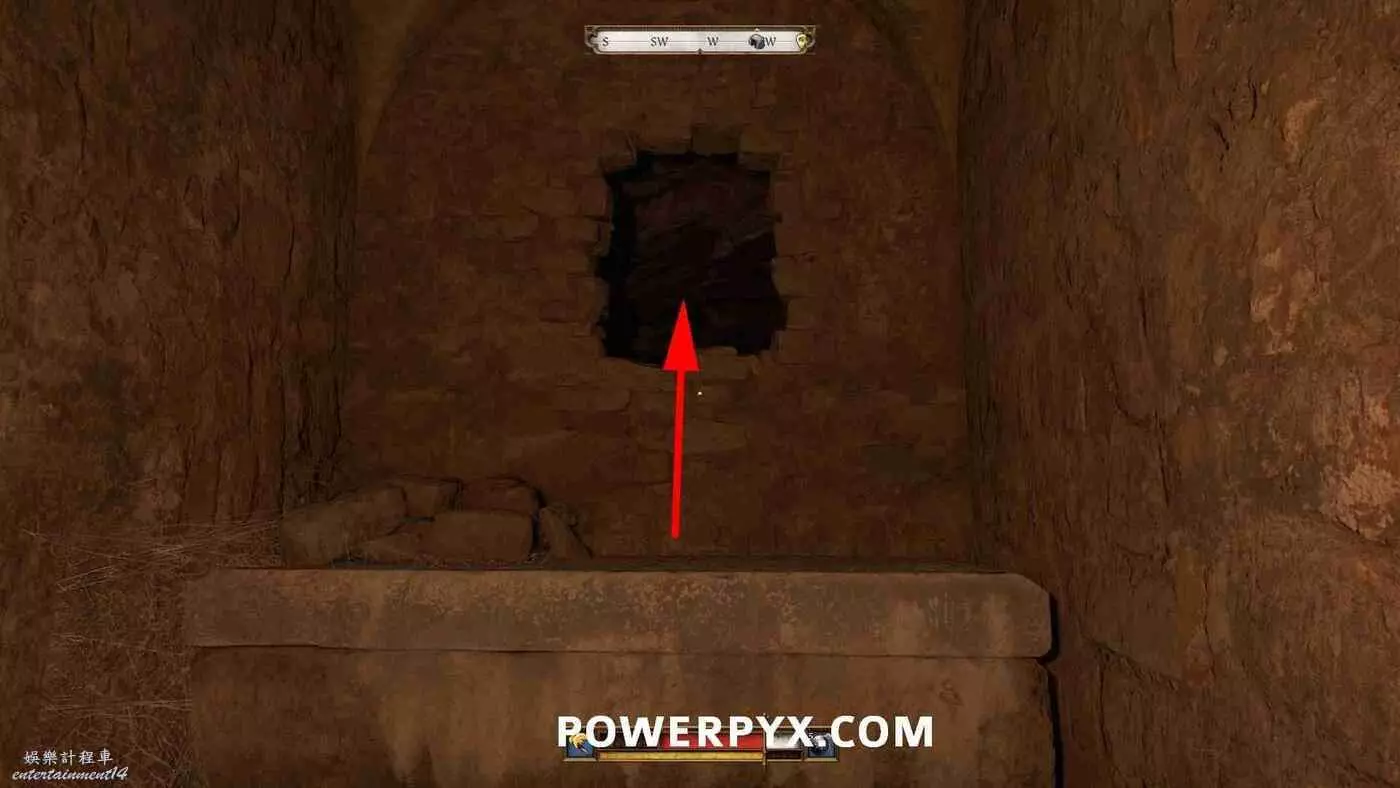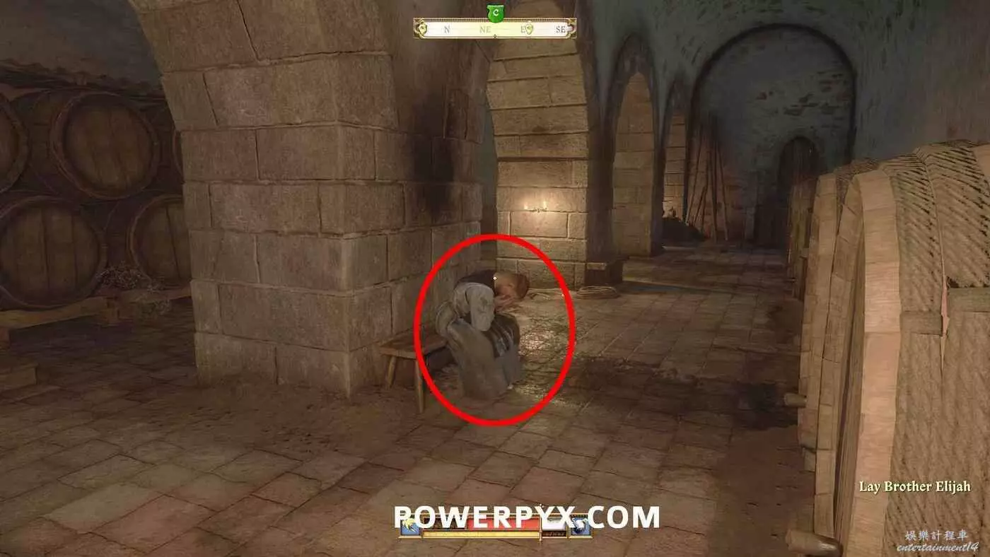 地圖上會以洞穴標記顯示【通往地窖的樓梯】。地窖有多個入口,通過南門離開教堂返回中央庭院,然後走左邊的下一扇門,在樓梯下的走廊盡頭進入地窖的門。裡面非常暗,建議提前裝備火把(按十字鍵下)。