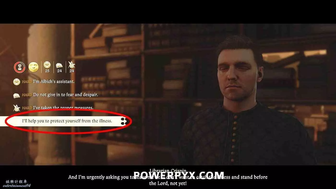 前往圖書館與圖書館員克裡斯平交談。選擇如下選項。