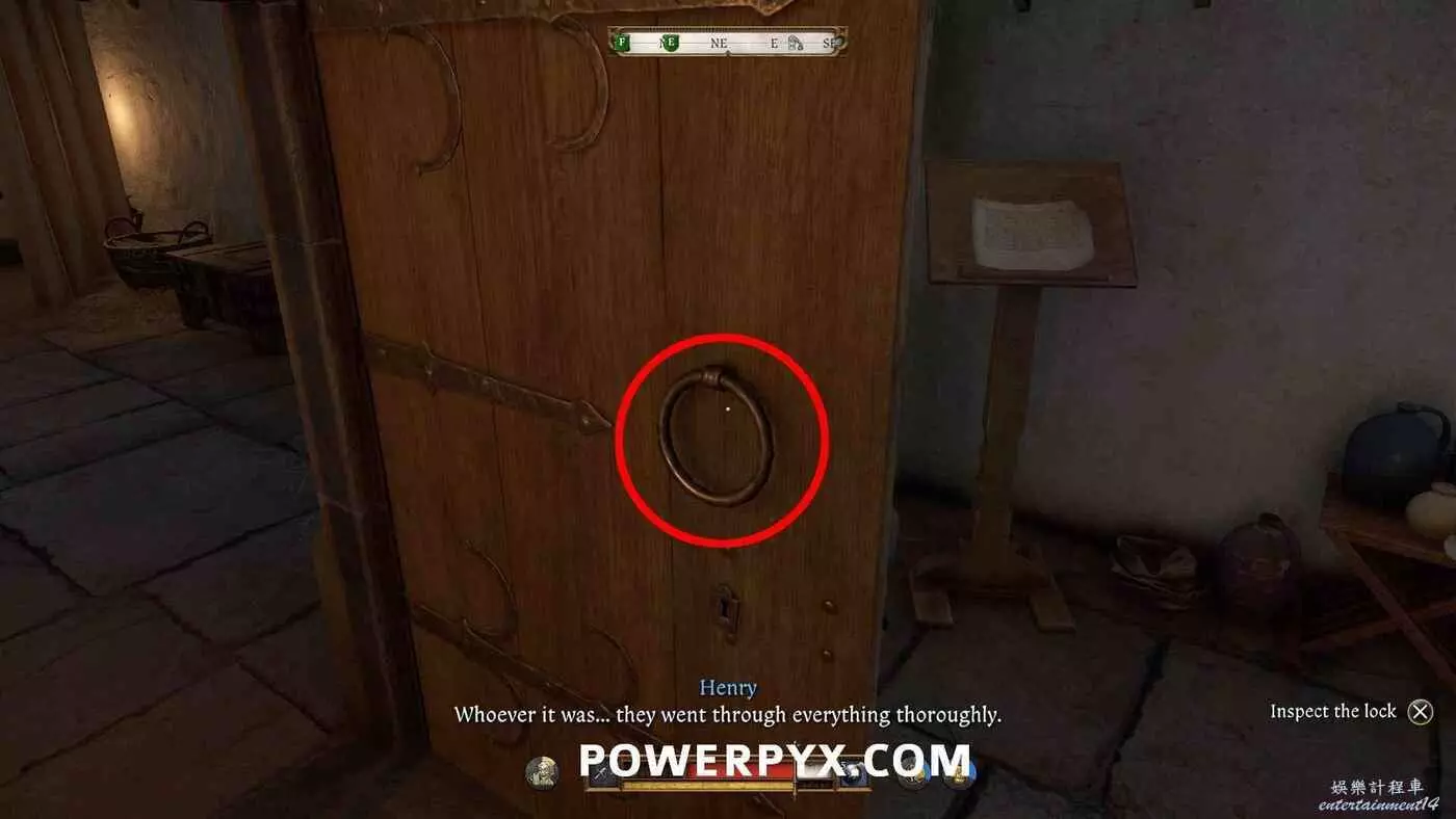 然後朝著腳印指引的方向爬過架子。穿過木桶,在梯子旁邊看到酒窖密室的門。門上了鎖,觸發任務目標【尋找酒窖密室的鑰匙】。